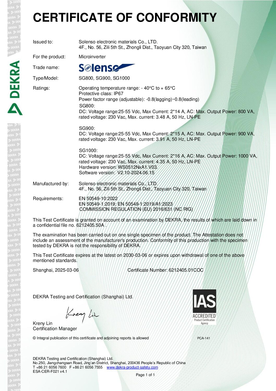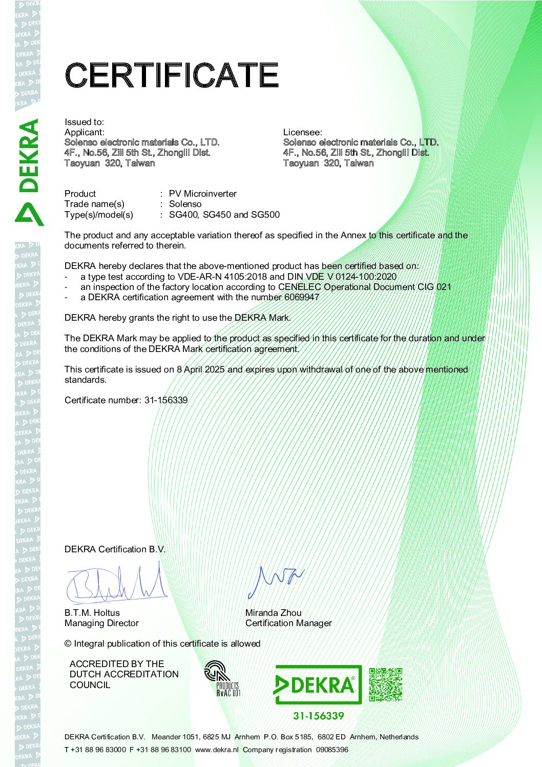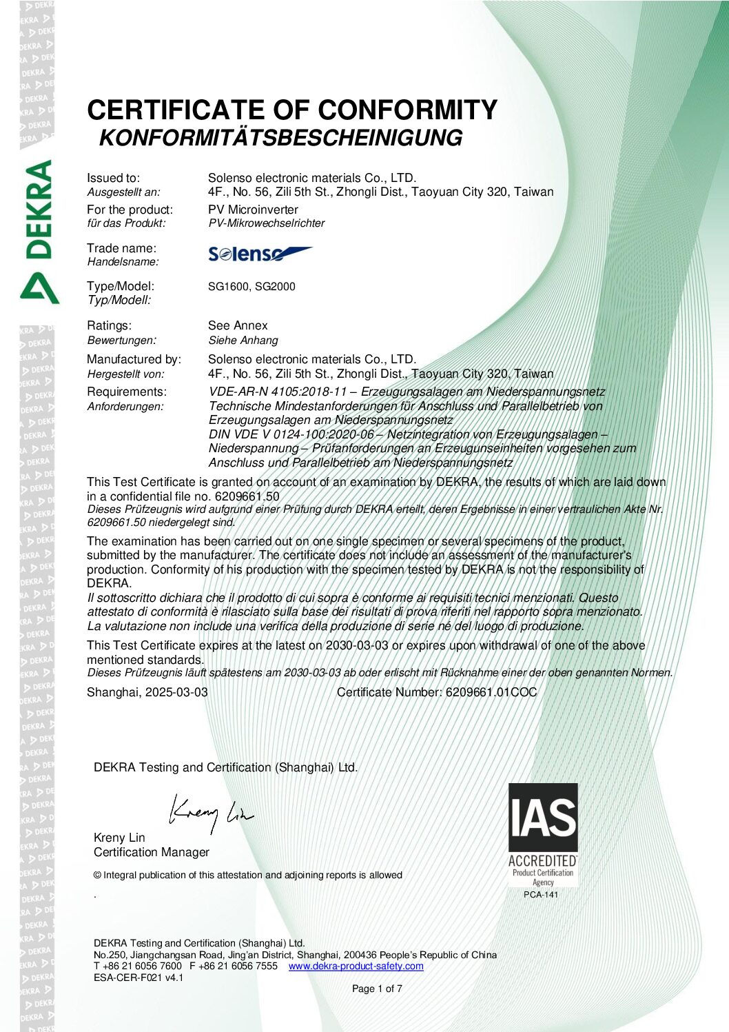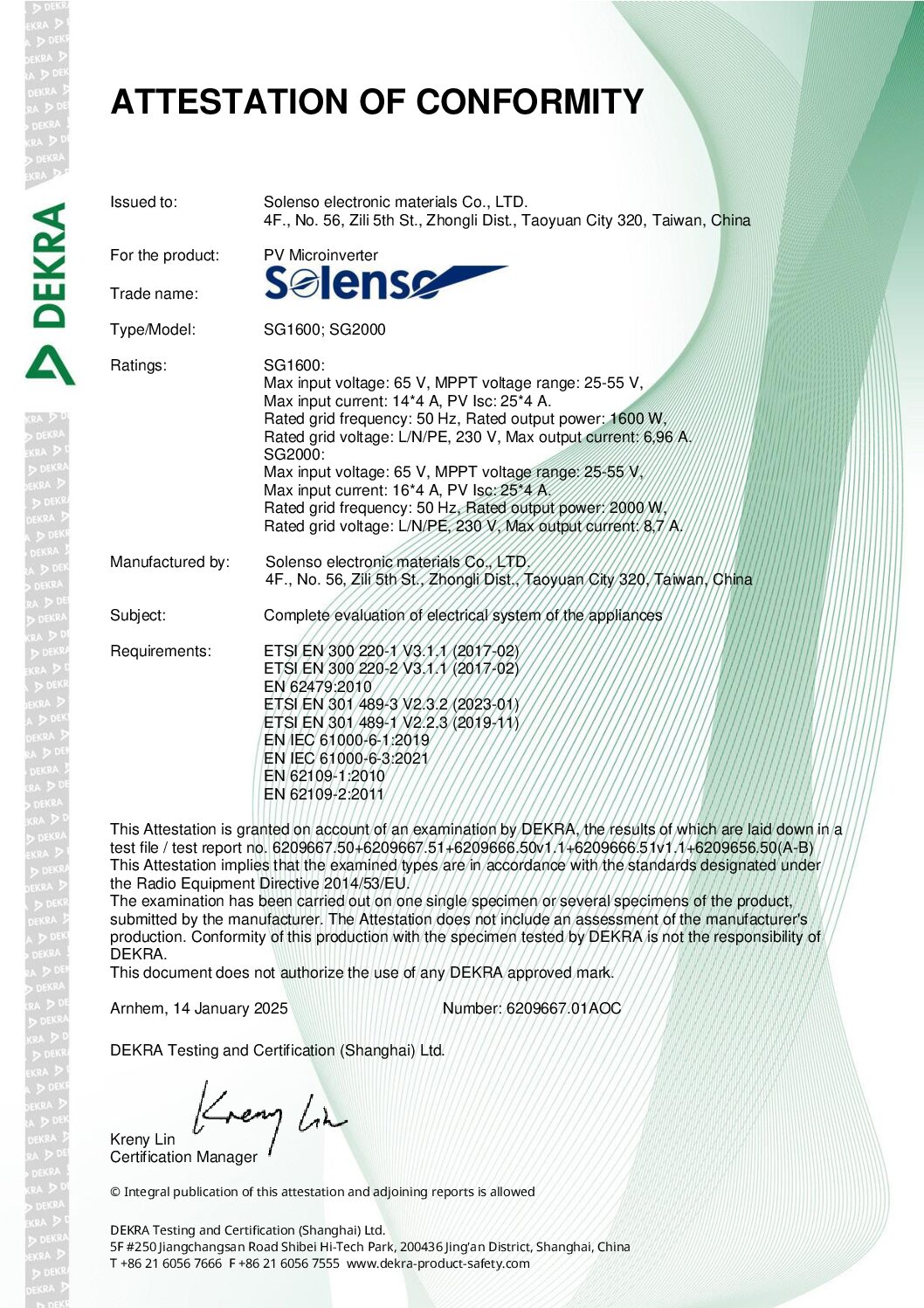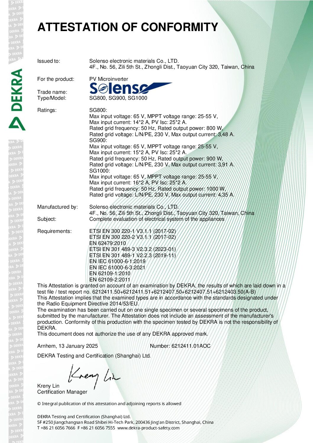 Certifications Home ressources Certifications Micro-inverter SG 400 / 450/ 500 CE-6217538.01_AOC_RED EN50549-6217535.01-COC EN50549-6217535.02-COC_signed VDE-6217536.01-DM-156339 VDE-6217536.02-DM-156340 SG 800 / 900/ 1000 CE-6217538.01_AOC_RED EN50549-6212405.01-COC EN50549-6212405.02-COC VDE-6212406.01-COC VDE-6212406.02-COC-NS SG 1600 / 2000 CE-6209667.01_AOC_RED EN-6209657.01-COC EN-6209657.02-COC EN-6209663.01-COC-PTPiREE VDE-6209661.01-COC VDE-6209661.02-COC DTU CE-6212426.01_AOC_RED PV Module 701262428502-00 CERT_TUV MARK_E HIT 701262428501-00 CERT_TUV MARK_E ICON