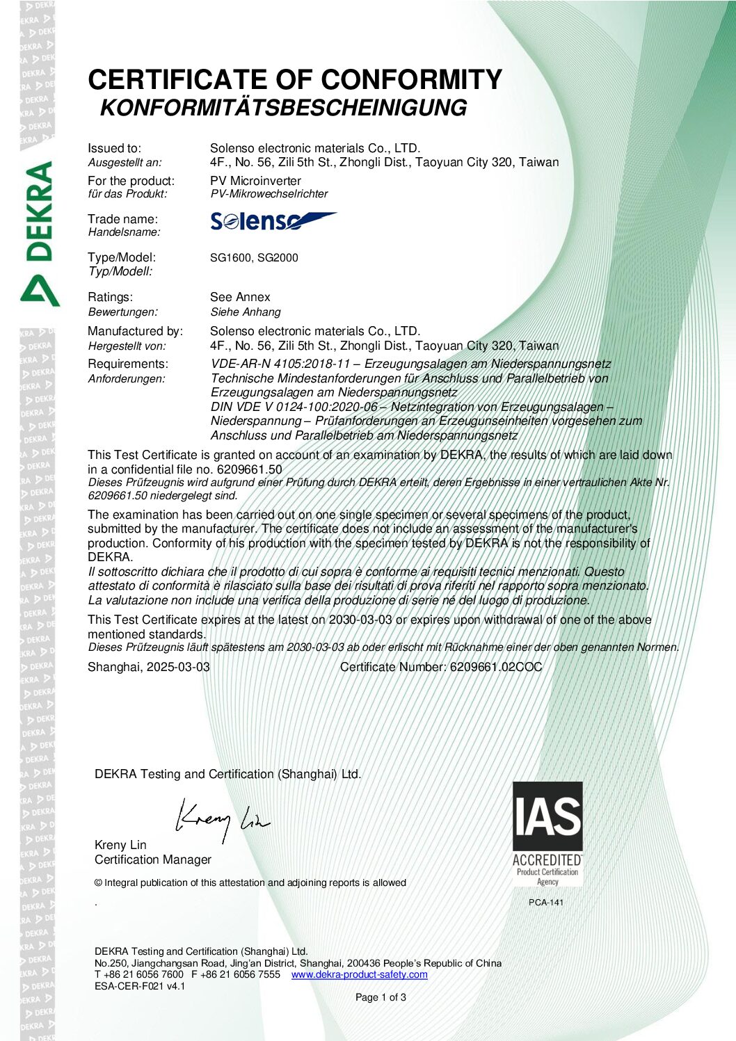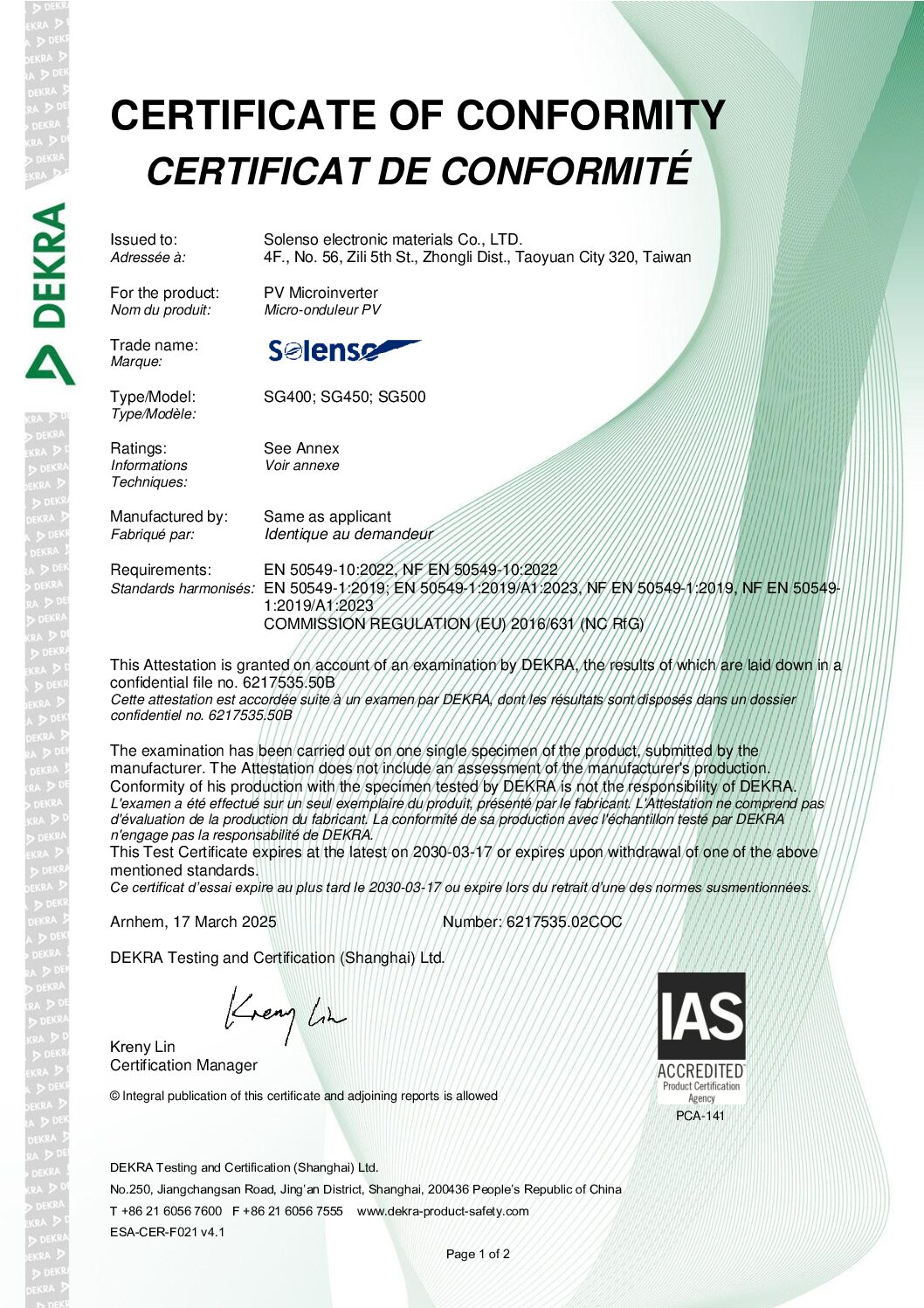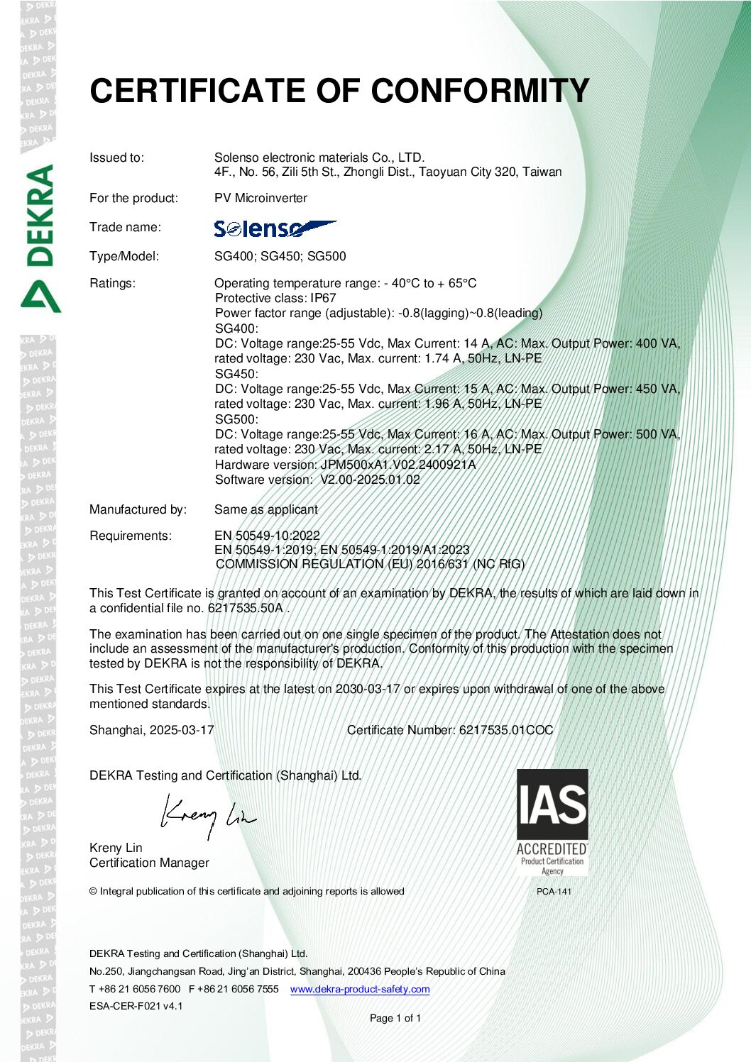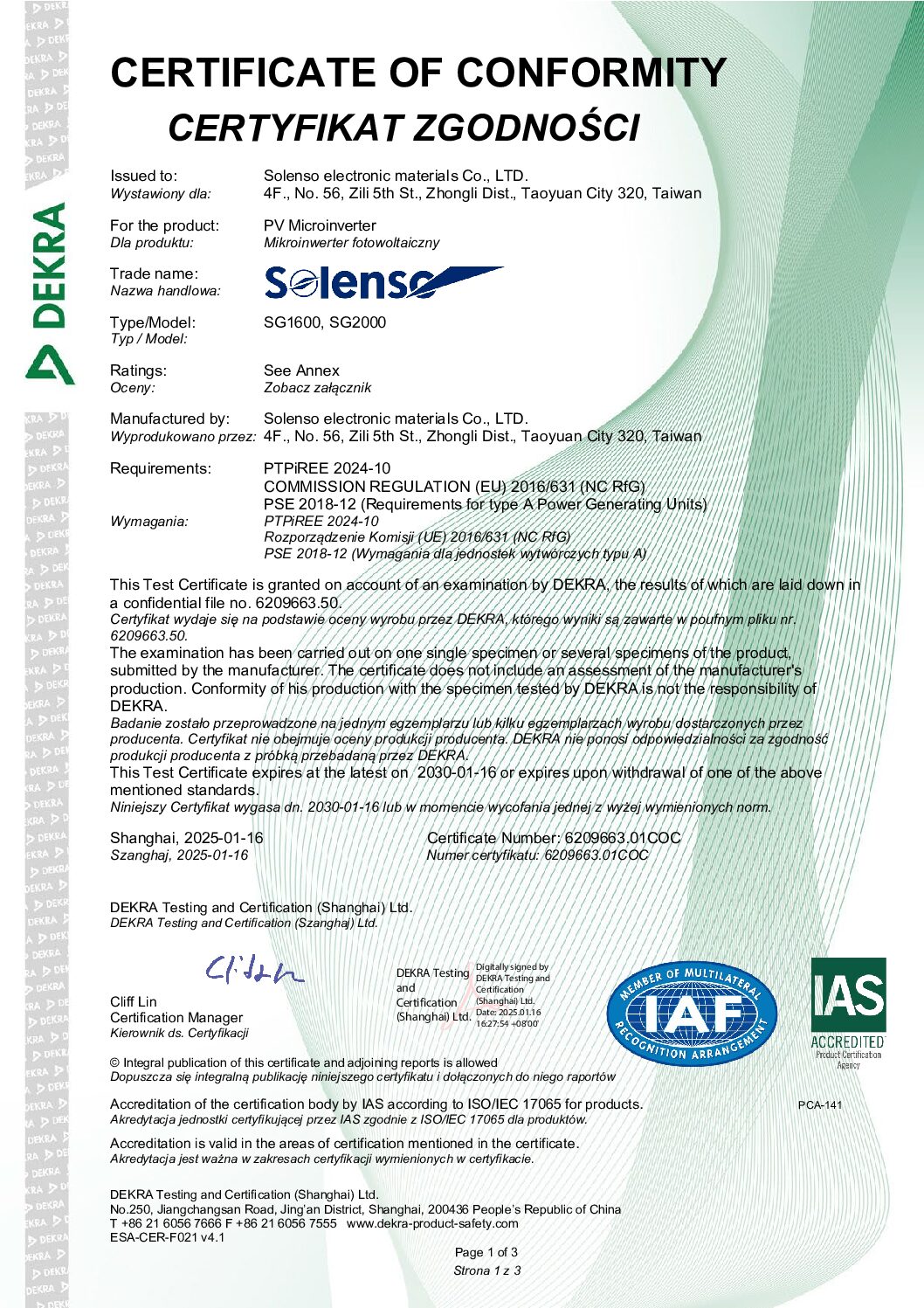 Certifications Home ressources Certifications Micro-inverter SG 400 / 450/ 500 CE-6217538.01_AOC_RED EN50549-6217535.01-COC EN50549-6217535.02-COC_signed VDE-6217536.01-DM-156339 VDE-6217536.02-DM-156340 SG 800 / 900/ 1000 CE-6217538.01_AOC_RED EN50549-6212405.01-COC EN50549-6212405.02-COC VDE-6212406.01-COC VDE-6212406.02-COC-NS SG 1600 / 2000 CE-6209667.01_AOC_RED EN-6209657.01-COC EN-6209657.02-COC EN-6209663.01-COC-PTPiREE VDE-6209661.01-COC VDE-6209661.02-COC DTU CE-6212426.01_AOC_RED PV Module 701262428502-00 CERT_TUV MARK_E HIT 701262428501-00 CERT_TUV MARK_E ICON