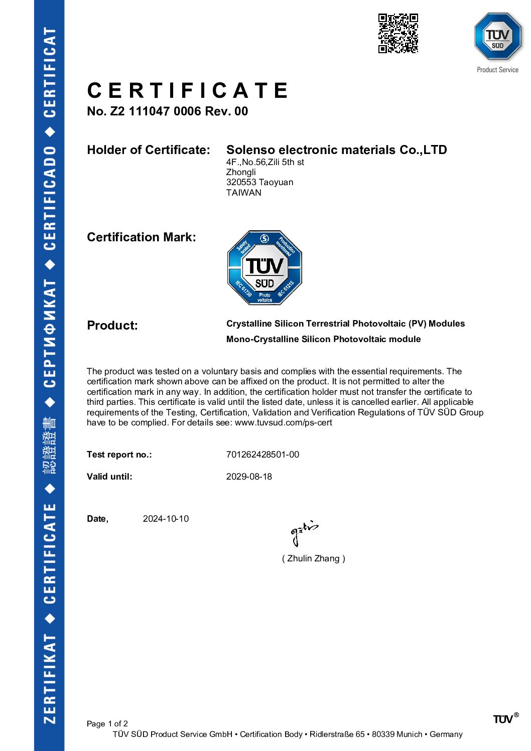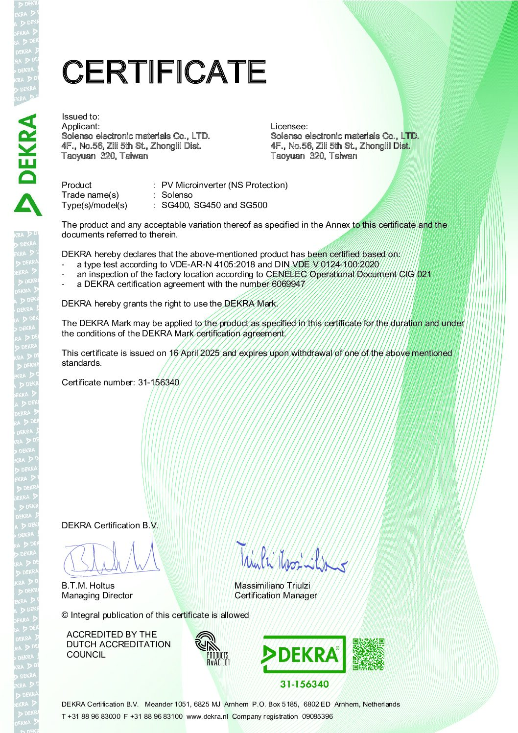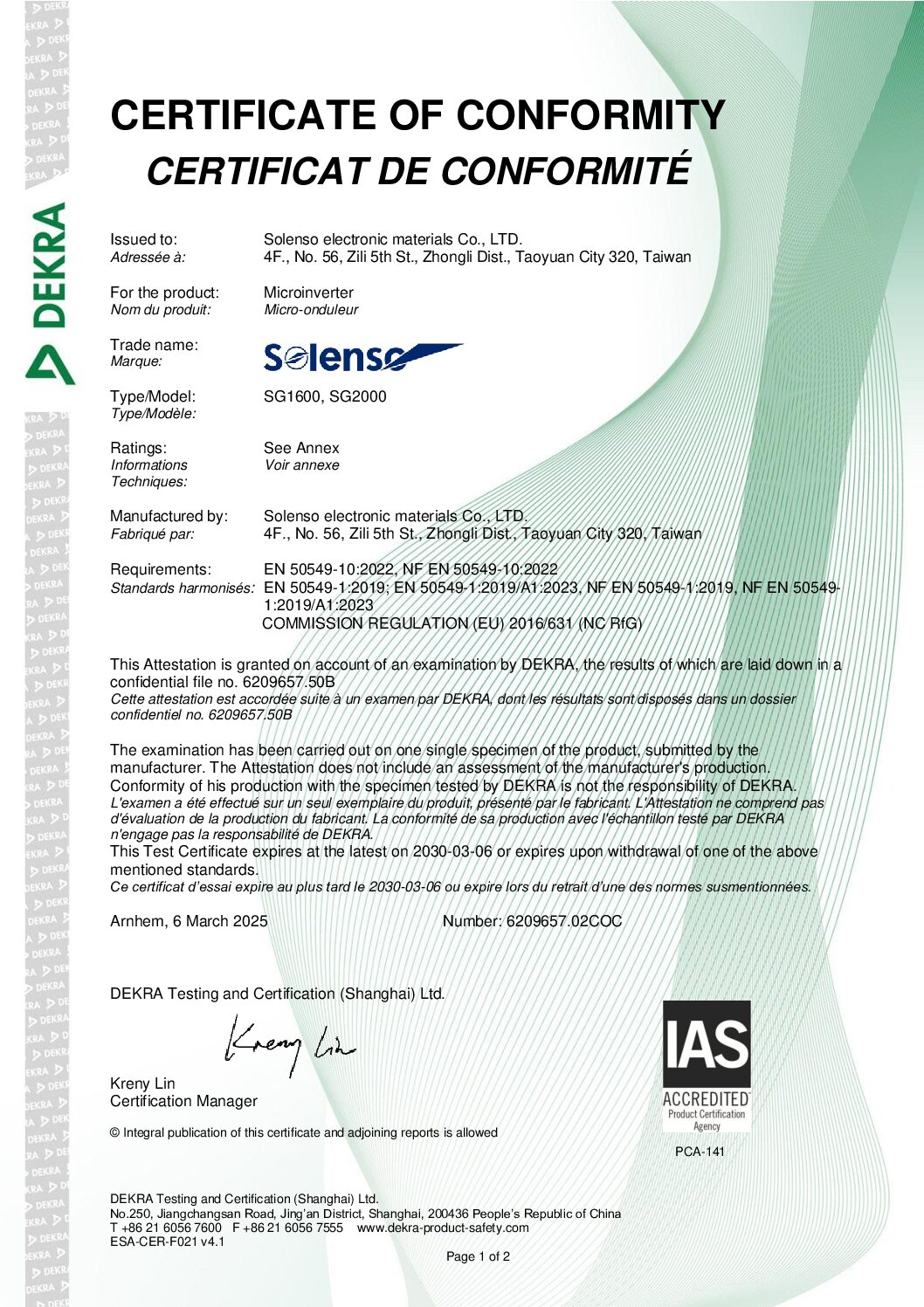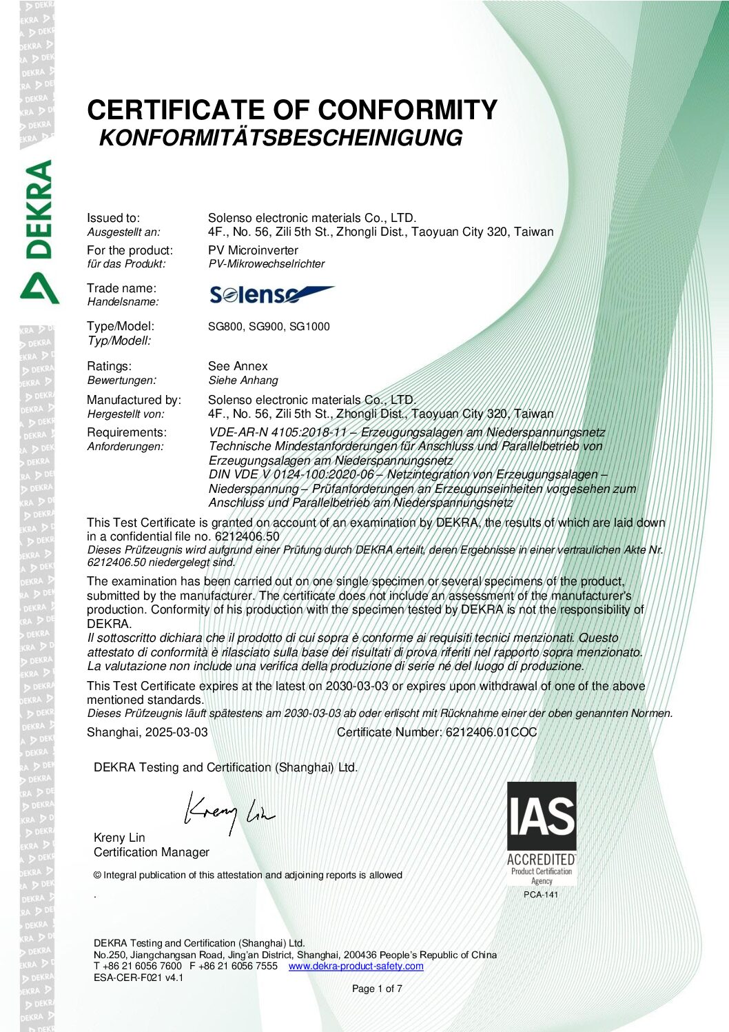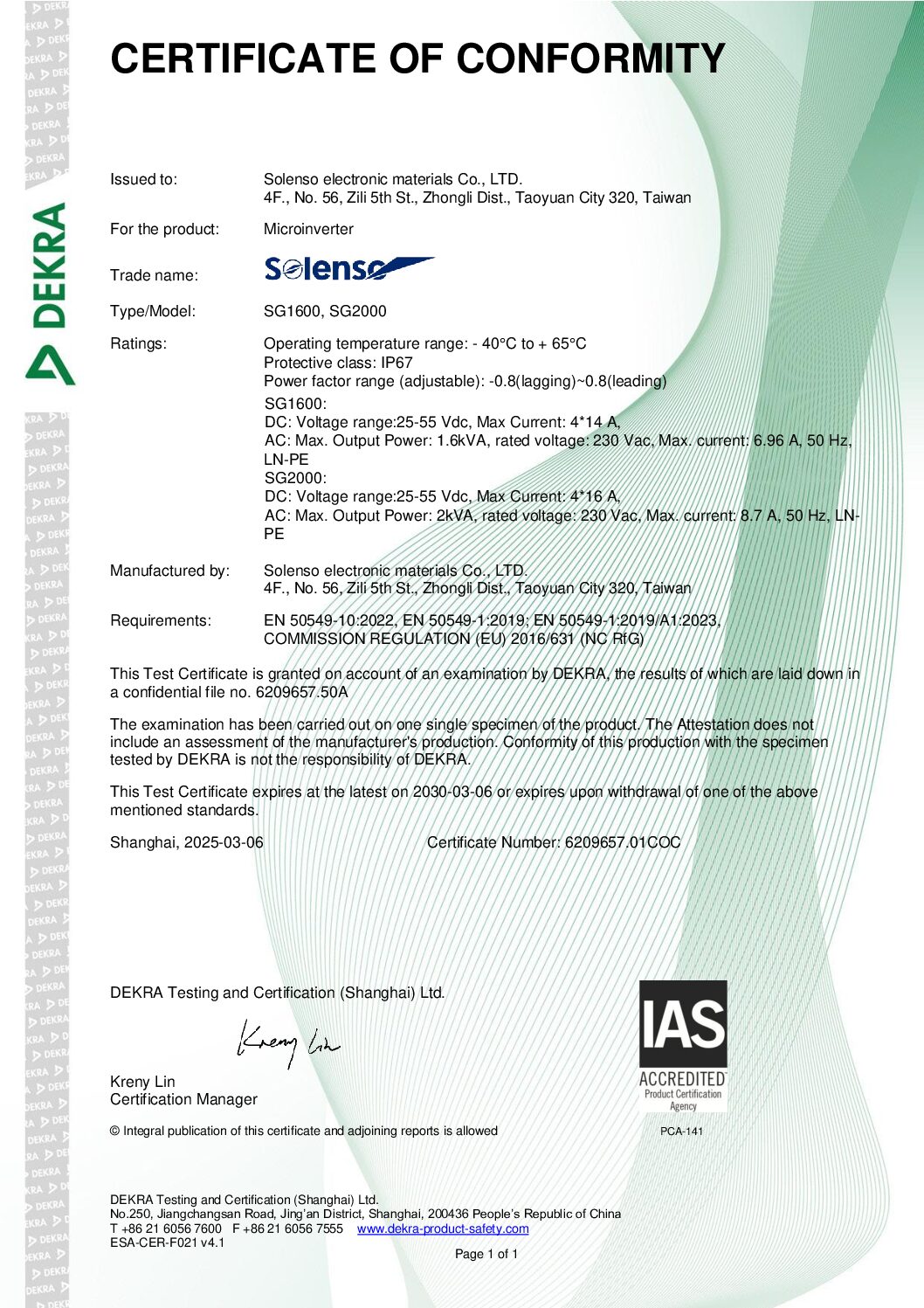 Certifications Home ressources Certifications Micro-inverter SG 400 / 450/ 500 CE-6217538.01_AOC_RED EN50549-6217535.01-COC EN50549-6217535.02-COC_signed VDE-6217536.01-DM-156339 VDE-6217536.02-DM-156340 SG 800 / 900/ 1000 CE-6217538.01_AOC_RED EN50549-6212405.01-COC EN50549-6212405.02-COC VDE-6212406.01-COC VDE-6212406.02-COC-NS SG 1600 / 2000 CE-6209667.01_AOC_RED EN-6209657.01-COC EN-6209657.02-COC EN-6209663.01-COC-PTPiREE VDE-6209661.01-COC VDE-6209661.02-COC DTU CE-6212426.01_AOC_RED PV Module 701262428502-00 CERT_TUV MARK_E HIT 701262428501-00 CERT_TUV MARK_E ICON